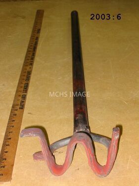 Heavy steel pipe handle, 3 feet long fastened to flat steel bar which denotes the WF Brand. Donor: "WF branding iron used by W.F. (Bud) Grounds, Sr. in the late 1800's. Used by W.F. Grounds, Jr. in the early 1900's."