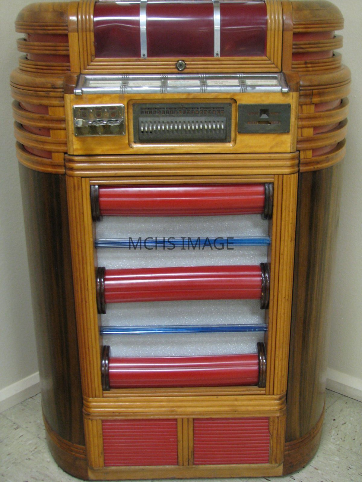 Seebring Symphonola J. P. Seebring Corp Chicago Ill., Walnut, Maple and plastic case. 1938, Played 78 rpm records -double sided selections. Selections from the 1930's and 40's. One selection for 5 cents, 2 selections for 10 cents and three selections for a quarter.(A)