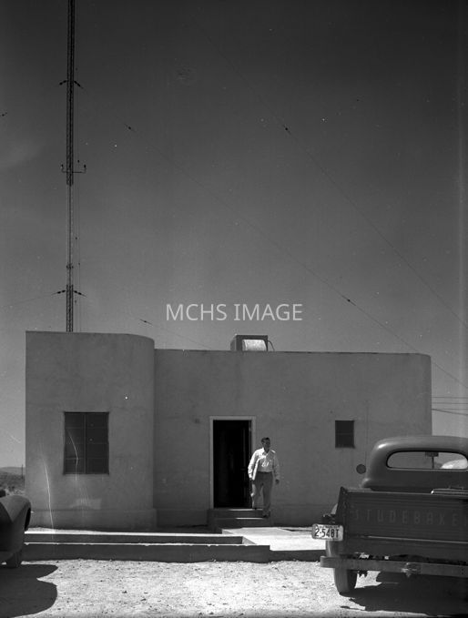 A small stucco building, a man is coming out the door. A Studebaker pickup truck is parked in front. Article in the newspaper February 16, 1956Collection