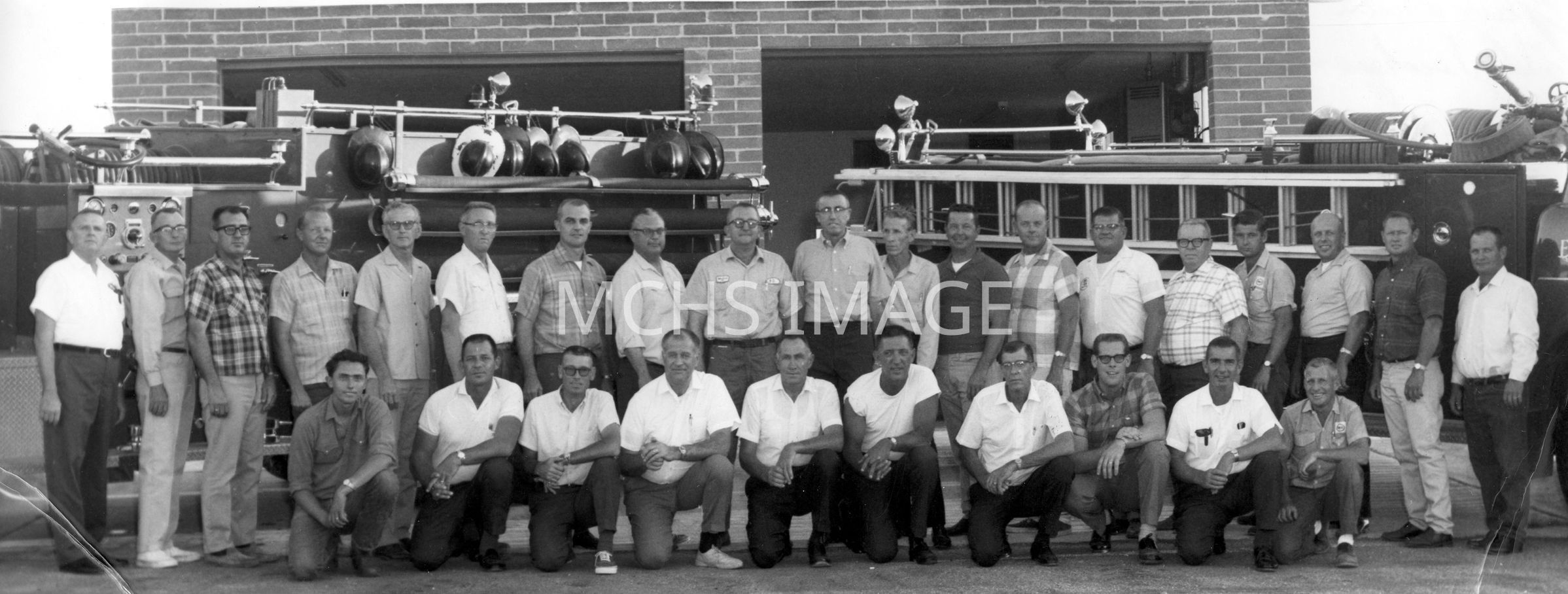 Group photo of the Volunteer Fire Dept. Standing l to r: Jimmie Cox, Donald Connell, John Eaton, Carl Wright, Gus Reichardt, George Henry, Nolan Davis, Alva K. McBrayer, J. D. Howell, Ted Heichsenring, Mac Taylor, Eddie Myers, Sid Luke. Bottom row: Butch Henry, Lee Williams, Jim Voss, Ralph Watson, Blaine Benson, Bill Klein, Bill Casson, Bill Watson, Wesley Allen, Stub Shaefer, Charles Potter, Bentley Marshall, Joe Chambers, John Osterman, Lawson Bradley, Bob MortonOther Names and Numbers