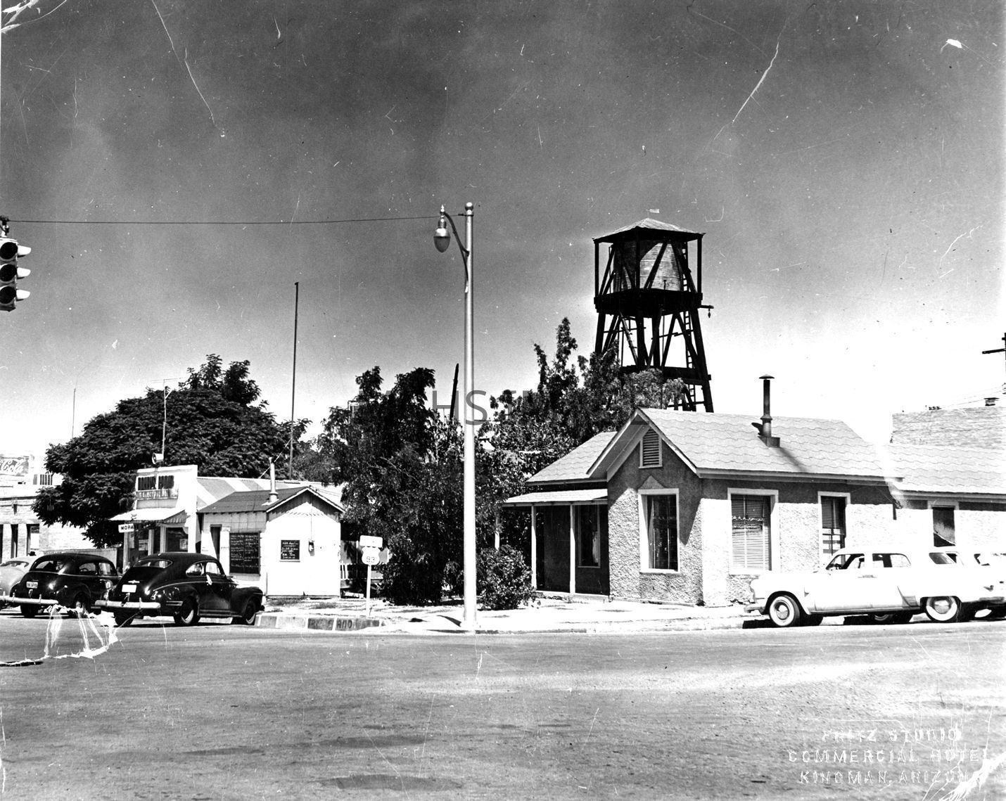 Corner of 4th and Beale Street where J. C. Penny's was built in early 1950's. Automobiles, buildings and a water tank on a corner in downtown Kingman.Other Names and Numbers