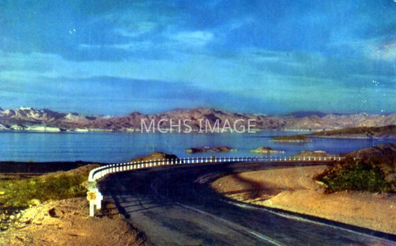 "This view of Lake Mead can be seen from U. S. transcontinental Highway 466 which crosses the crest of Hoover Dam. The rugged mountains surrounding Lake Mead give some ideal of the difficulties encountered by the Bur. Of Reclamation Engineers in ConstOther Names and Numbers
