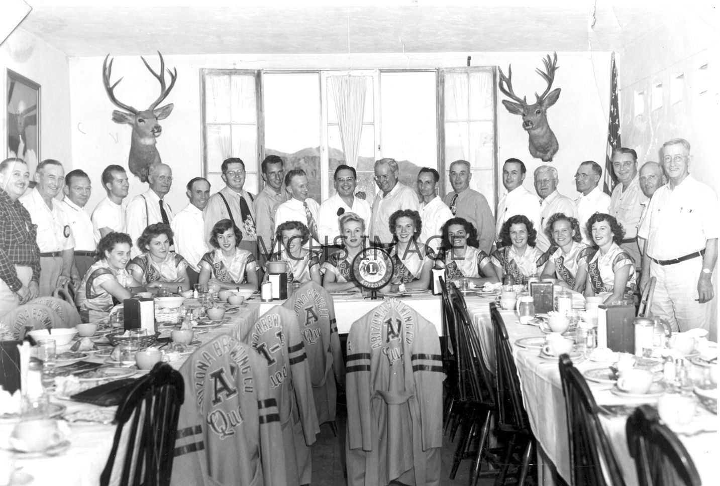 Standing left to right; Joe Senz, Harry Phillips, Harry Walker, Joe Borden, Judge Faulkner, unknown, Tucker, unknown Alex Thompson, unknown, Doc Richards, Beale Masterson, Lyle Hennifen, B.C. Hendrick, Kirk Tatum, Major Grey, unknown, Johnny Mullen, unknown. The women seated are a Women's professional Softball team from Phoenix known as the "A-1 Queens". Photo appears to be taken at the El Trovatore restaurant.Other Names and Numbers