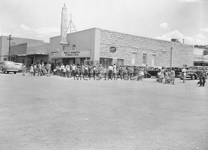 Exterior photograph of the State Theater, 4th and Beale, Kingman for Lions Kids Theater Party held on 20 July 1946.Collection