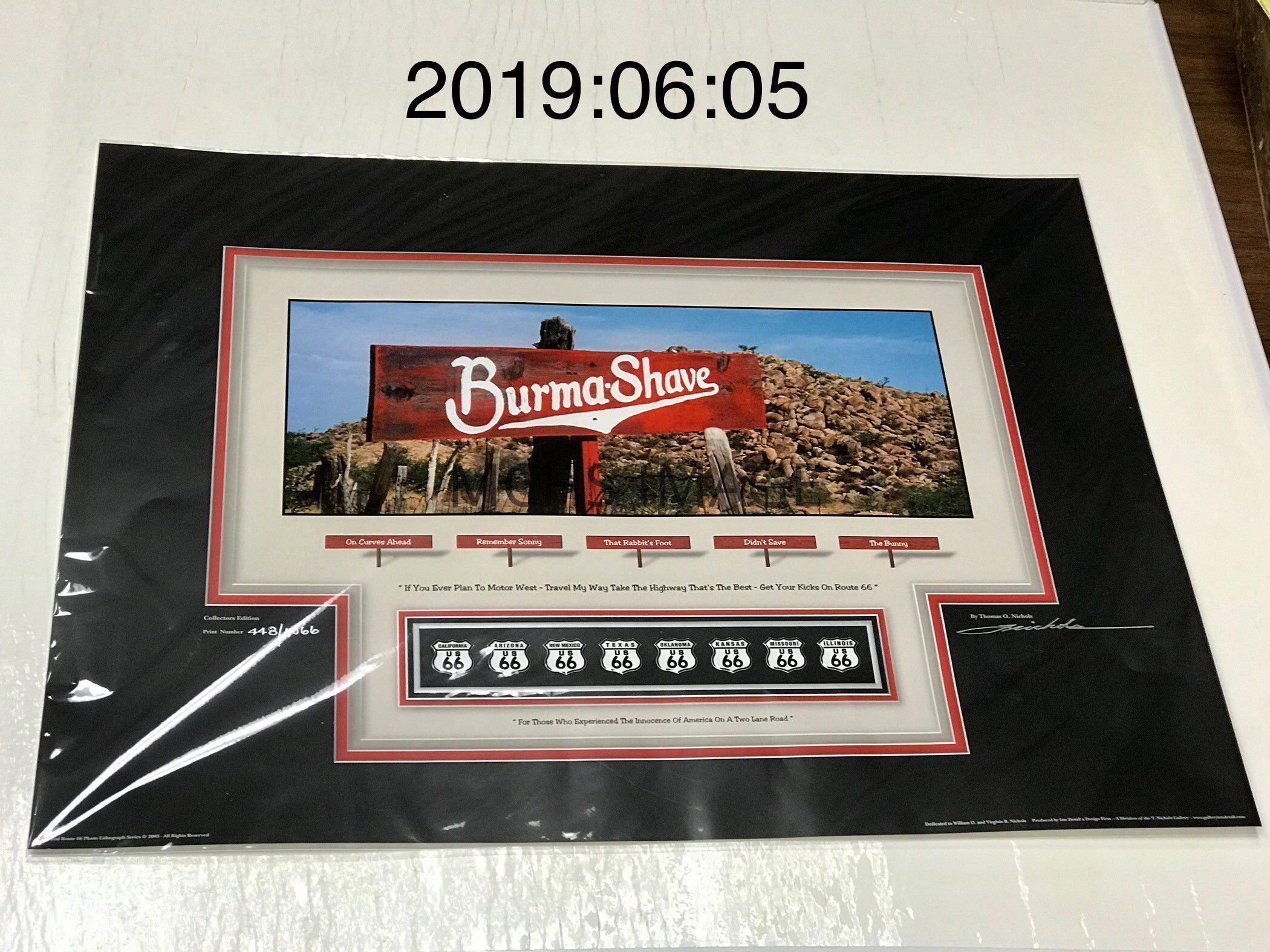 24" x 18" Lithographic poster (6 process), titled "Burma Shave" "Collectors Edition #448 of 1066" . At bottom "Dedicated to William O. & Virginia B. Nichols." A trbute to the signs along Route 66. Produced by Inn Detail, a Design Firm. - A division of the T. Nichols Gallery. -