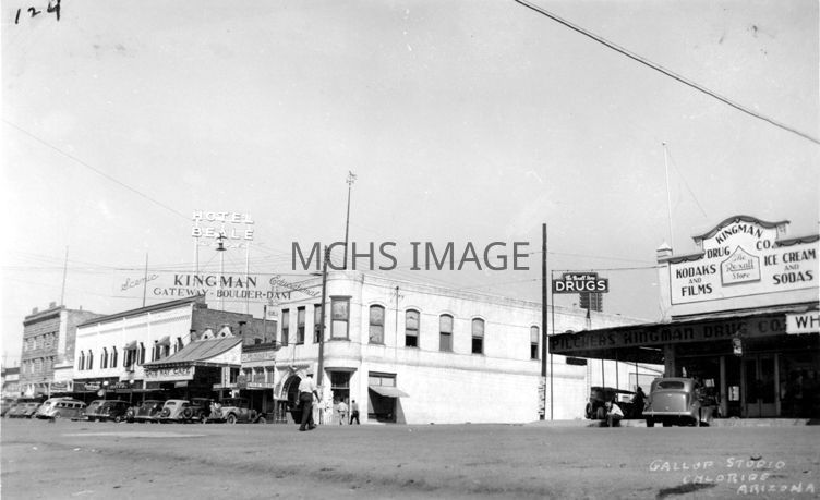 Looking NW from Andy Devine & 4th St. A man is crossing the intersection, a banner is above, and several cars are parked in front of the businesses.Collection