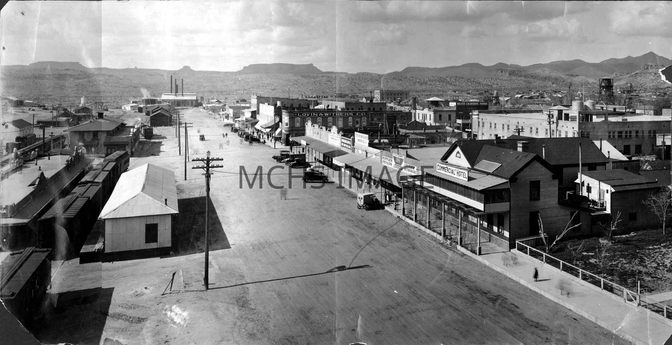 View taken of Front Street (Now Andy Devine). On left of photo is Santa Fe Station, Harvey House, and at right is Beale Hotel, and Brunswick Hotel.Collection