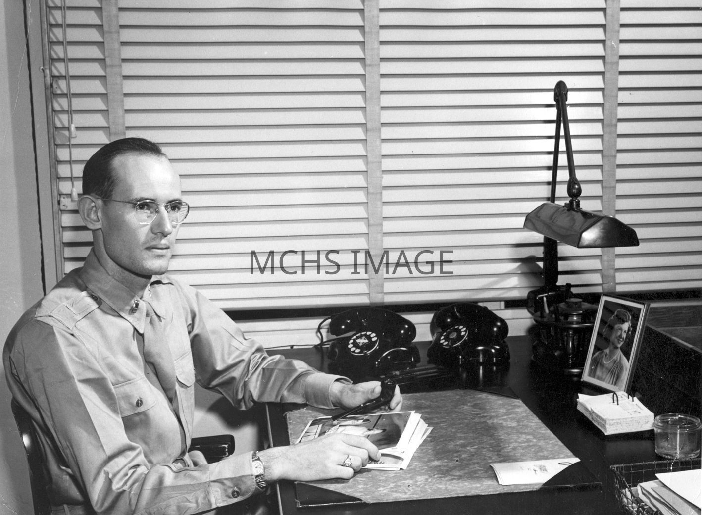 Lt. Carlos Hall Elmer at his desk in Hawaii during World War II. Hickham Field, Hawaii 7th Air Force, 1943.Collection