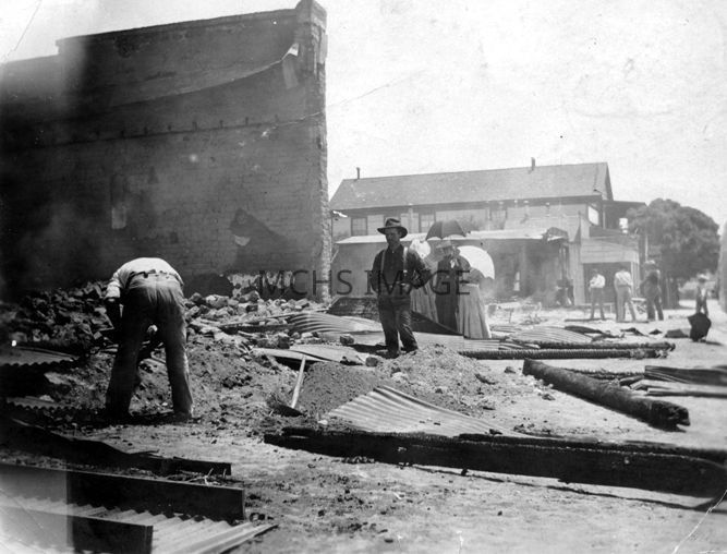 A photograph taken 15 June 1907 of the fire that destroyed a block of buildings known as the Luthy block on Front Street in Kingman, Arizona. Photo shows a man picking through the fire and others observing. The Commercial Hotel is in the background.Collection