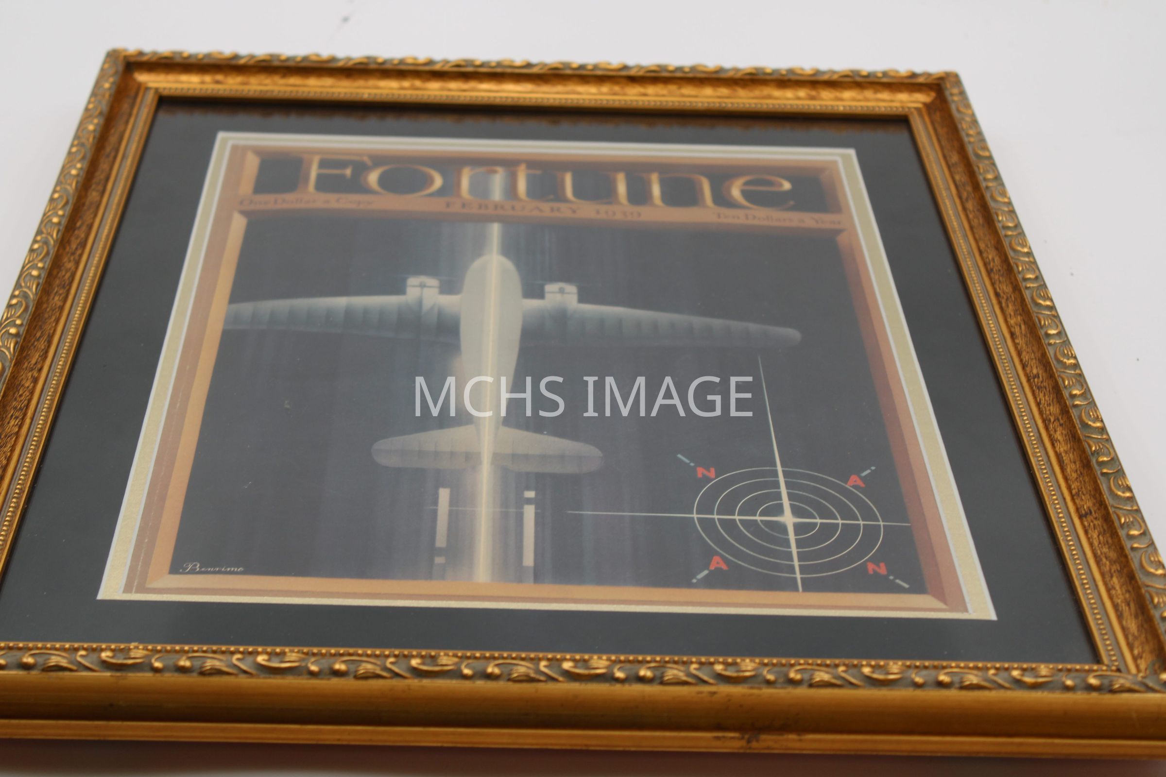 16"x20" heavy framed Fortune Magazine dated Feb.1939 and "signed" Benrimo (Thomas Benrimo). Picture is of a DC-3 Airliner and is an art deco piece. Frame is large, heavy, "golden" frame with swirls and leaves on outer border and rows of dots on inner border. Picture shows the words FORTUNE , One dollar a copy, February 1939, Ten Dollars a Year at the top of the photo. Picture is of a jetliner on a runway, with a "radar" scope with N,A,A, N on respective side portions of the "radar".Collection