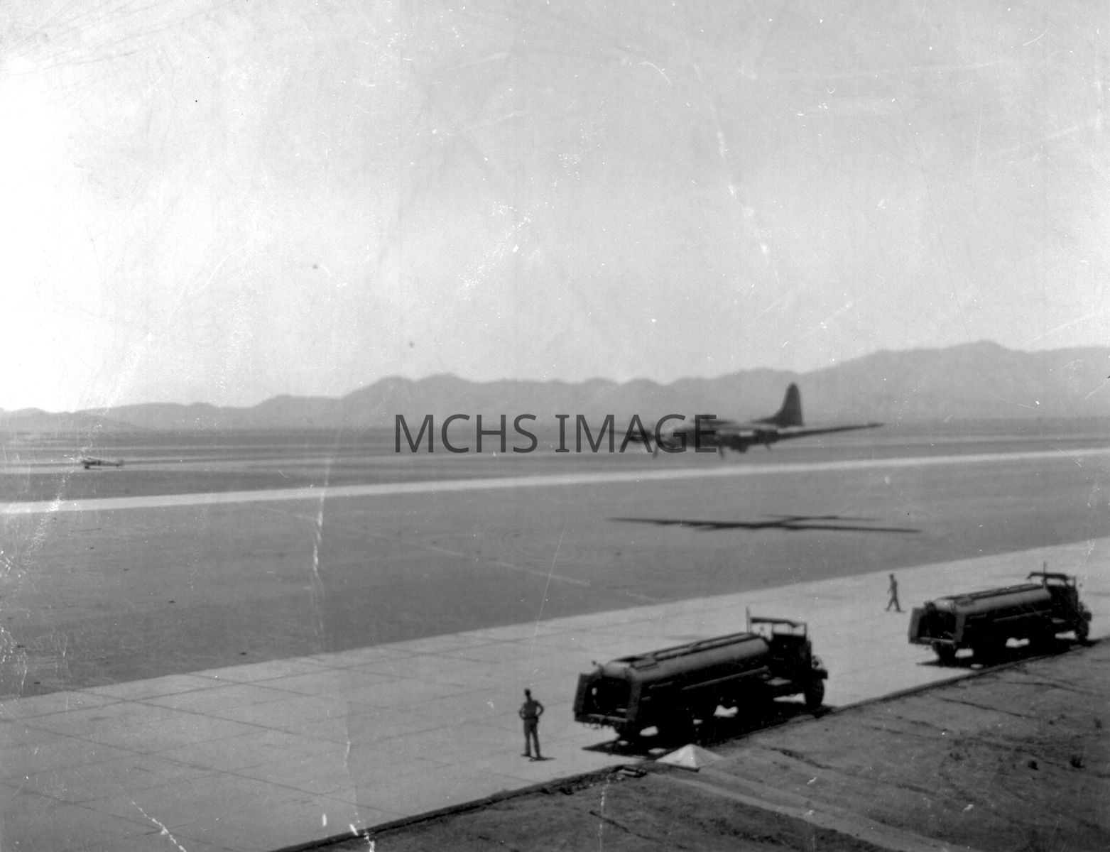 The Memphis Belle at Kingman Army Air Field on her triumphant tour of the United States after her spectacular combat career in Europe during World War II. Note: C45 on Runway in background. Informant: Ralph H. Lessor, Lt. Col. USAF Retired.Collection