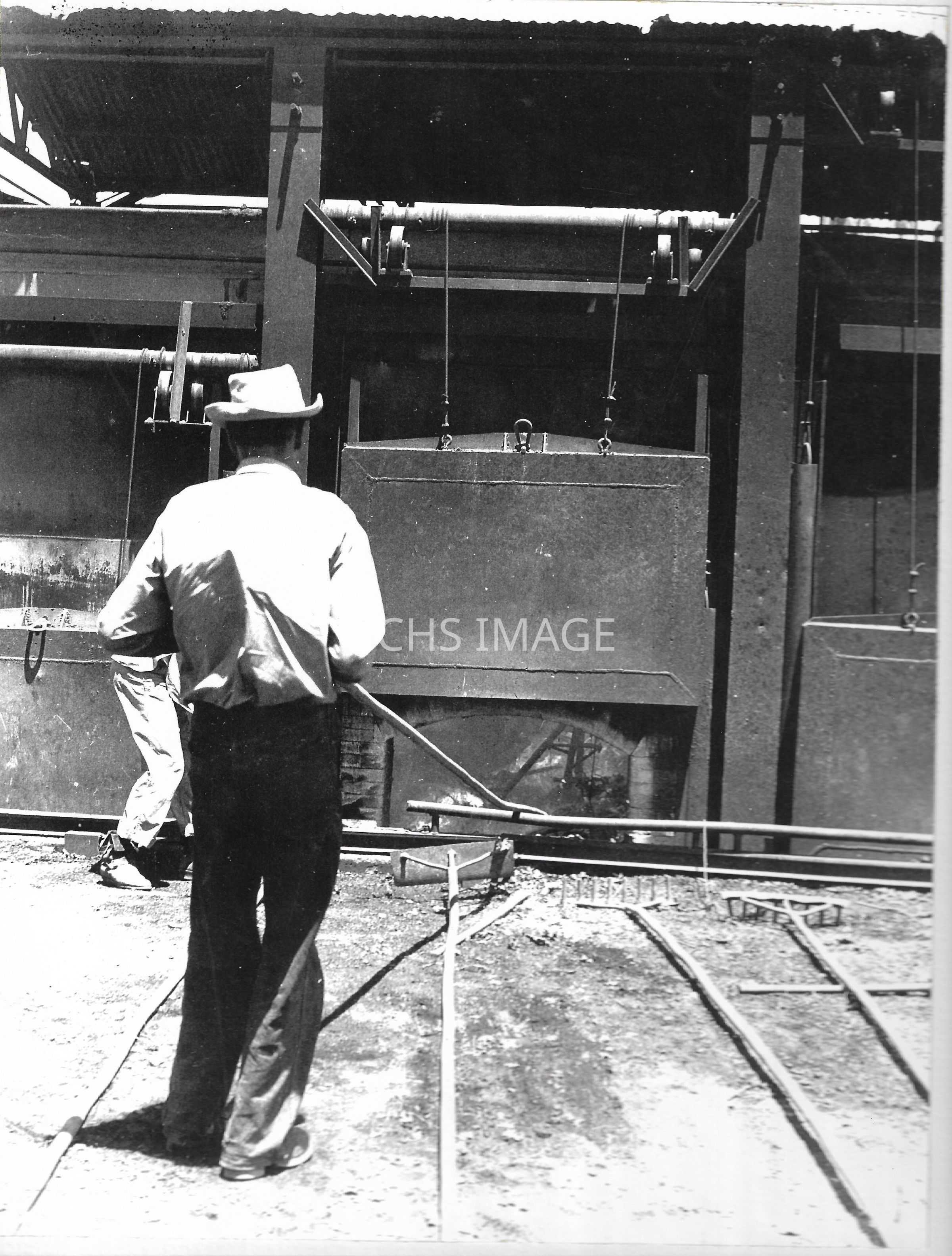 Black and white photos(2) two men, in front of a metal 3 door furnace