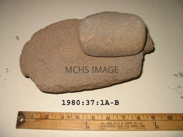 B - Mano is 4 - 1/2" long x 3 -1/4" wide x 2 - 1/4" high, grey stone, rounded. According to donor, used by White Mountains Apache Native American.