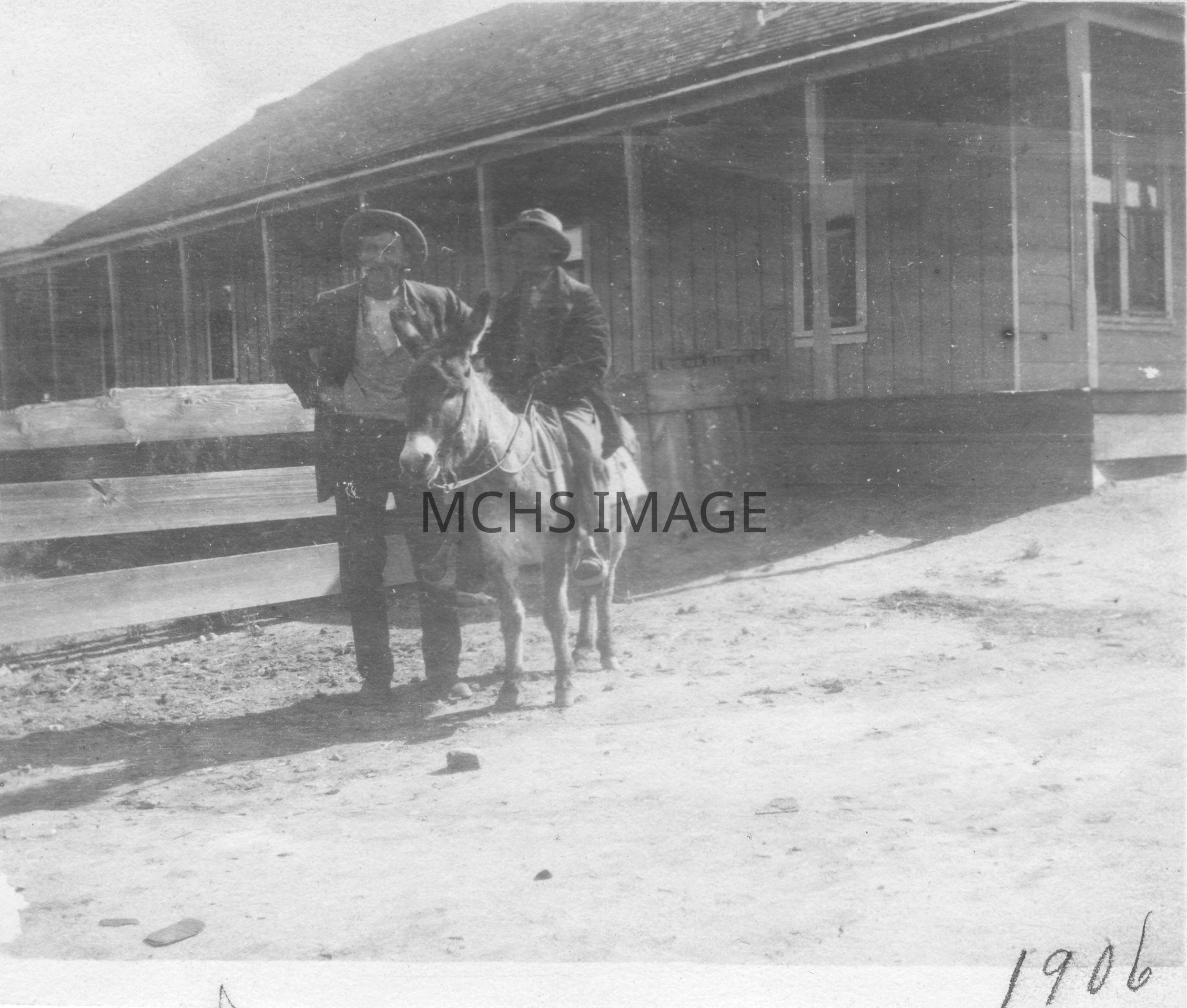 One man standing, one man on back of burro in front of the Metropol HotelCollection