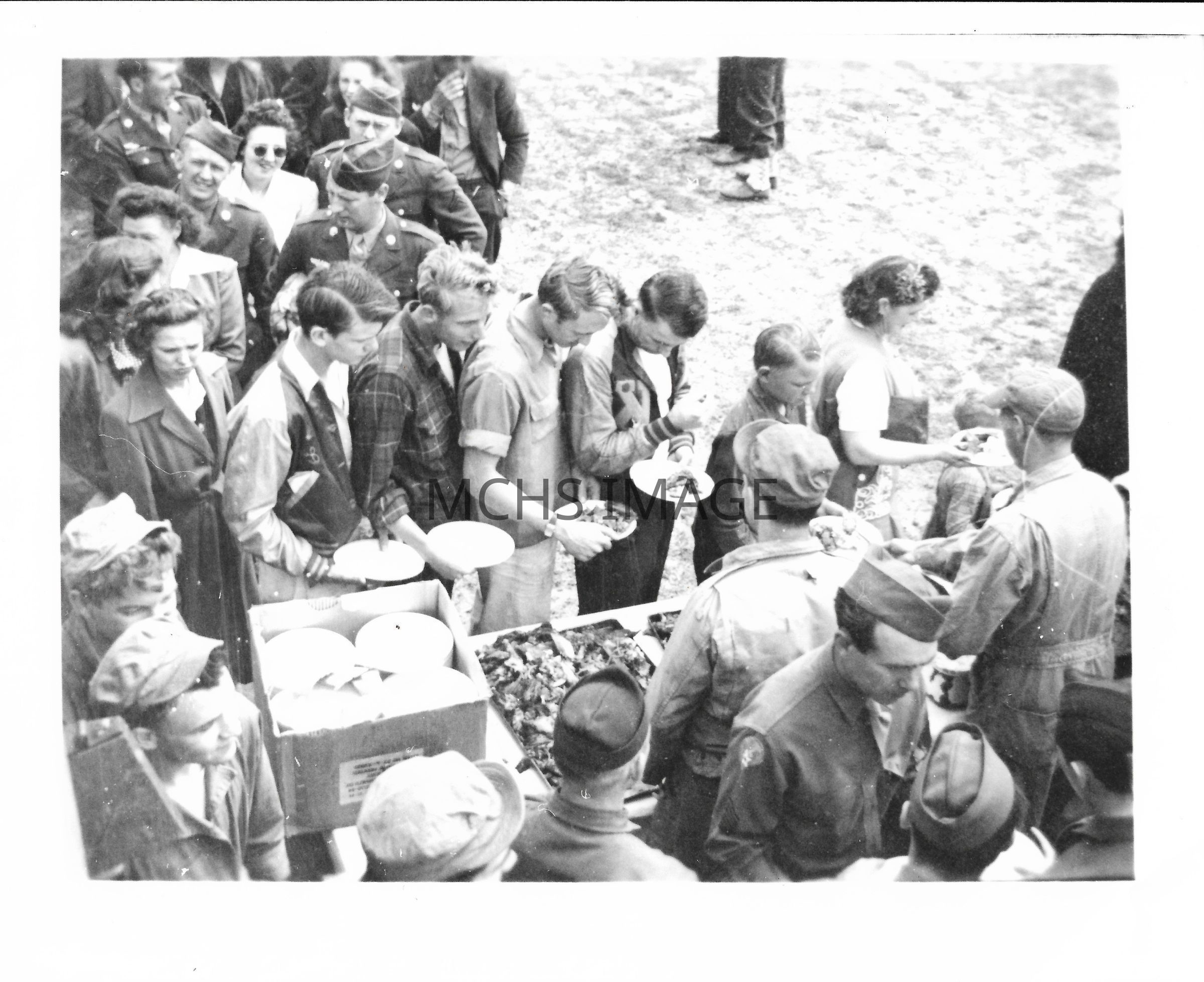 Black and white copy of photo. military personell and civilians at a barbeque. Neal ranchCollection