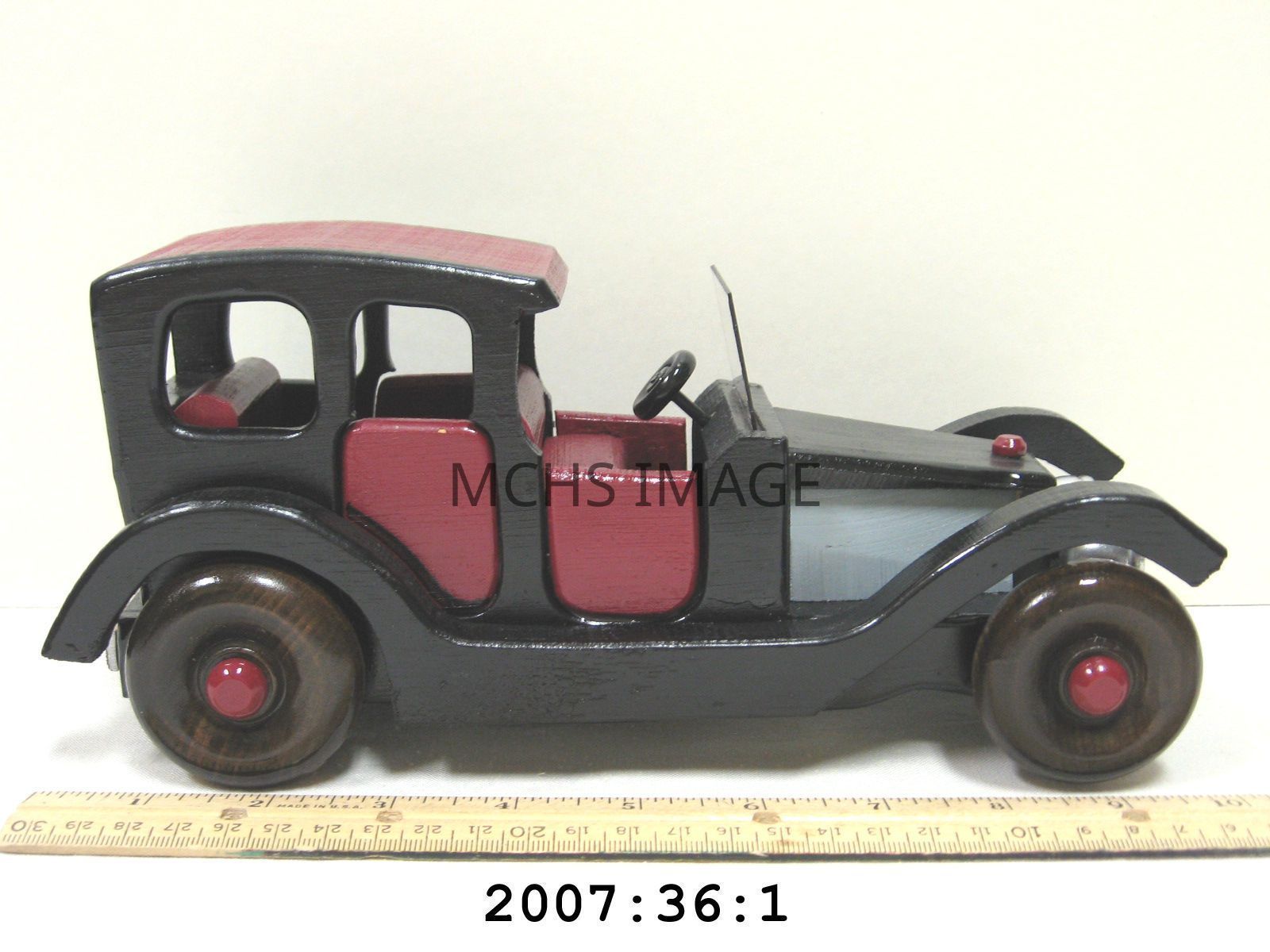 Model car (replica automobile) 10"Long x 4"Wide x 4.5"High, made by the donor. (Bill Hirsch) Excellent condition. Wooden replica of a 1927 Pierce-Arrow automobile.