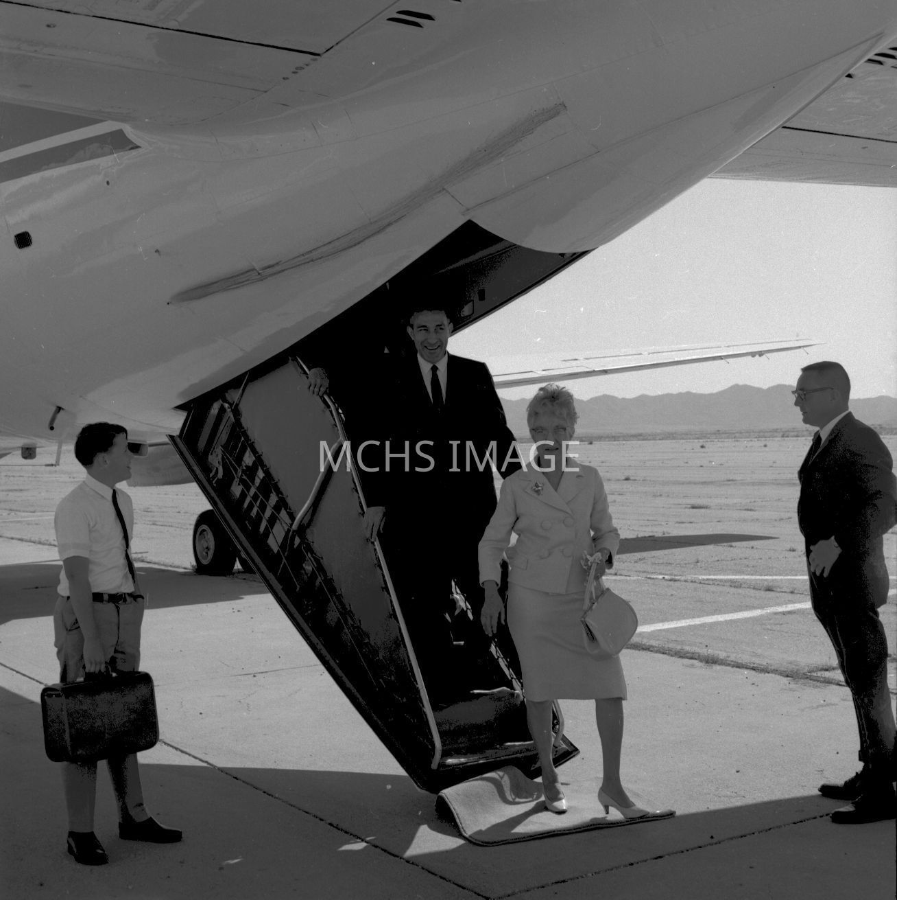 Guest speaker Secy of the Interior Stewart K. Udall and wife arriving by plane for the dedication of the Mohave County Museum.Collection