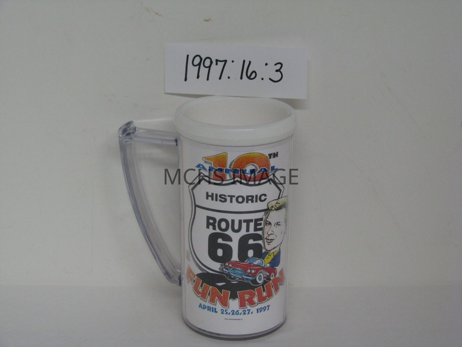 Souvenir cup is clear plastic, 10 oz. mug with a white liner which has the Route 66 Fun Run logo. April 1997.