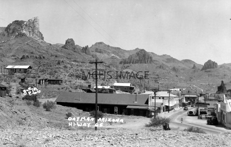 Oatman, taken with Highway 66 shown. At right is Walsh Building, in foreground is Theater ( Ridehour's), and in middle is Arizona Hotel.Collection