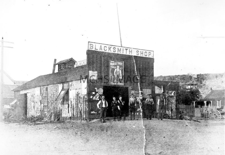 Exterior view of blacksmith shop, several well dressed men standing in front. Horseshoe Tobacco sign on building, "A Red-Hot Favorite". Jack Maddox Shop, 4th and Beale Street, entrance facing south, 4th from left, Charley Roe.Collection