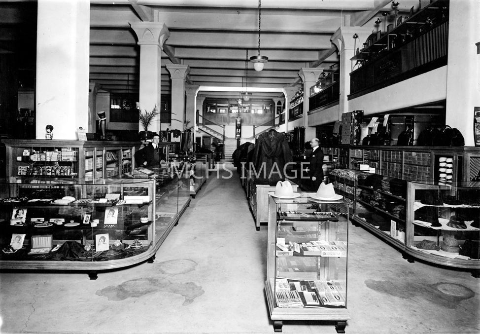 The opening of Central Commercial, two well dressed clerks are standing ready to serve. There is a fine collection of merchandise. The stairway in the back leads to the furniture dept on the right, on the left are the company offices. The view is from the 4th St entrance. Beale StreetCollection