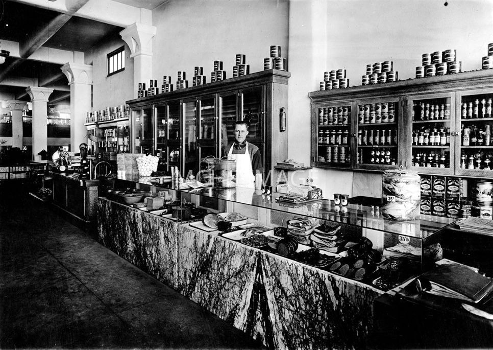 Grand opening of Central Commercial. A clerk with apron is behind the counter in the grocery dept. Catalogue No: 18:6:67 Beale StreetCollection