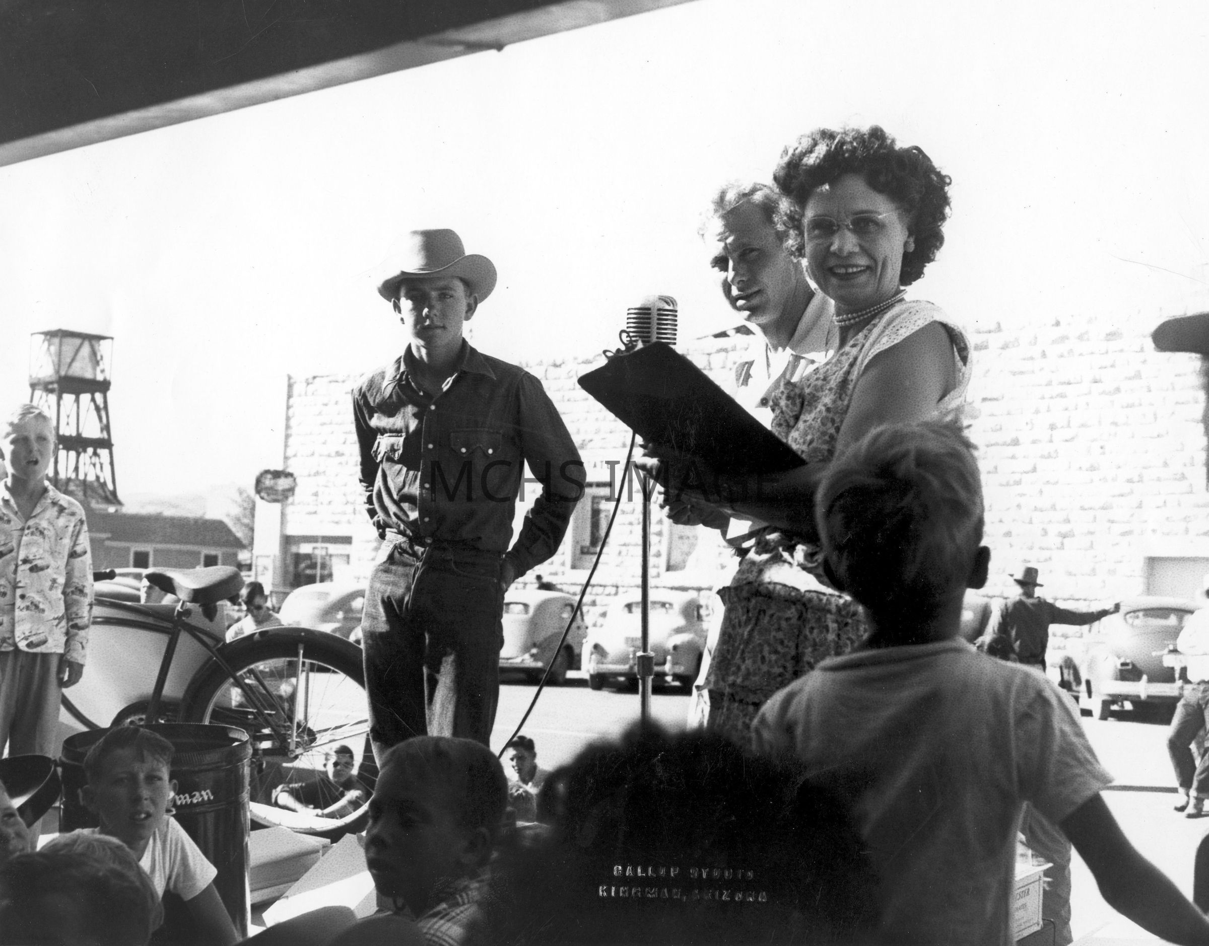 Promo at Central commercial. Woman, Lillian Kause, at microphone. State theater in background. Man in hat is John Neal and Jay Gates II is at microphone.Collection