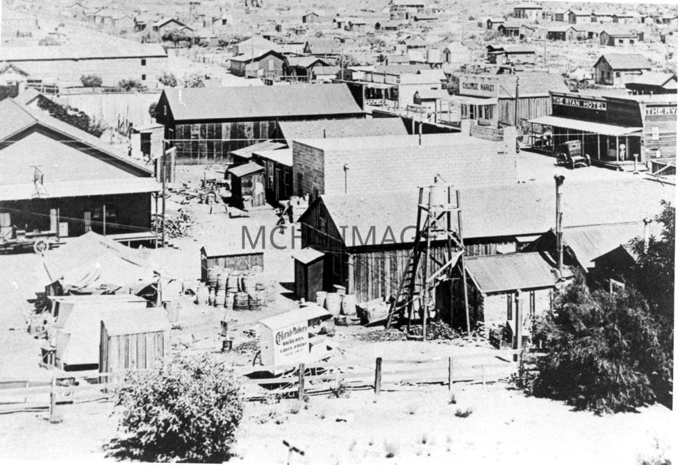 An overview of Chloride showing back of Chloride Drug Co. Also shows the post office and the Ryan Hotel, a saloon and bakery with Chloride Bakery wagon in backyard.Collection