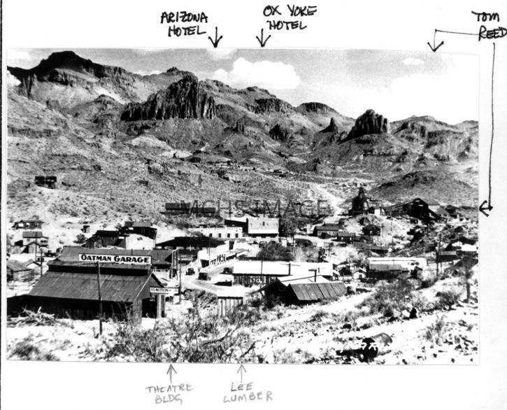View of Oatman, buildings; left to right theatre, Arizona Hotel, Ox Yoke Hotel Lee Lumber and at right Tom Reed Mine.Collection