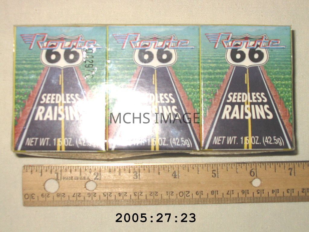 Package of six small boxes of raisins packaged for Route 66 commemorative 1961.