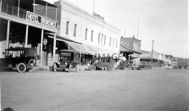 Panoramic view of the Hotels Brunswick & Beale. The road in front is dirt, there are several Model T cars. Front St. between 3rd and 4th (Andy Devine)Collection
