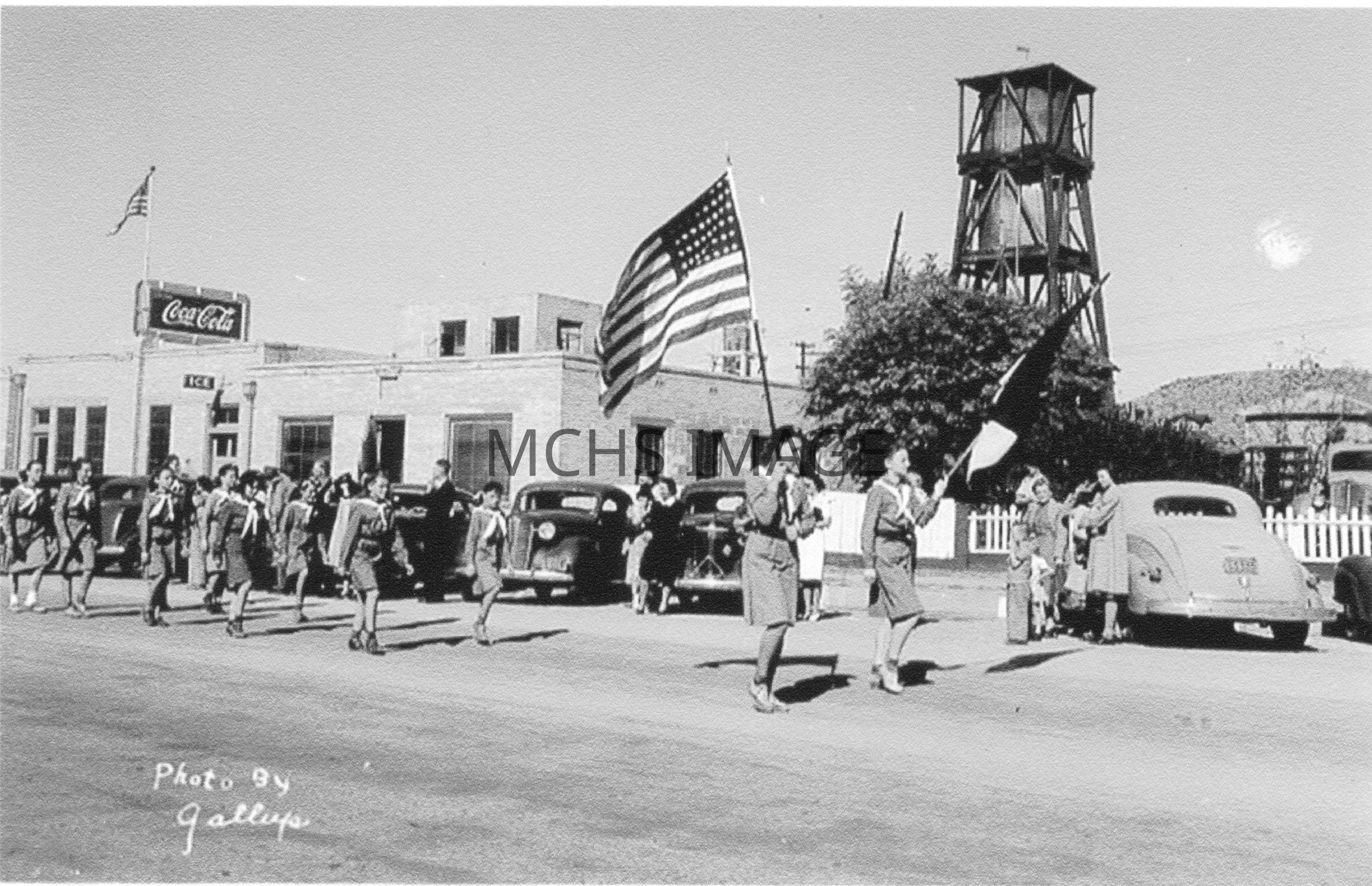 Girl Scouts marching in parade on Beale Street ca. 1948 showing old ice plant between 3rd and 4th.