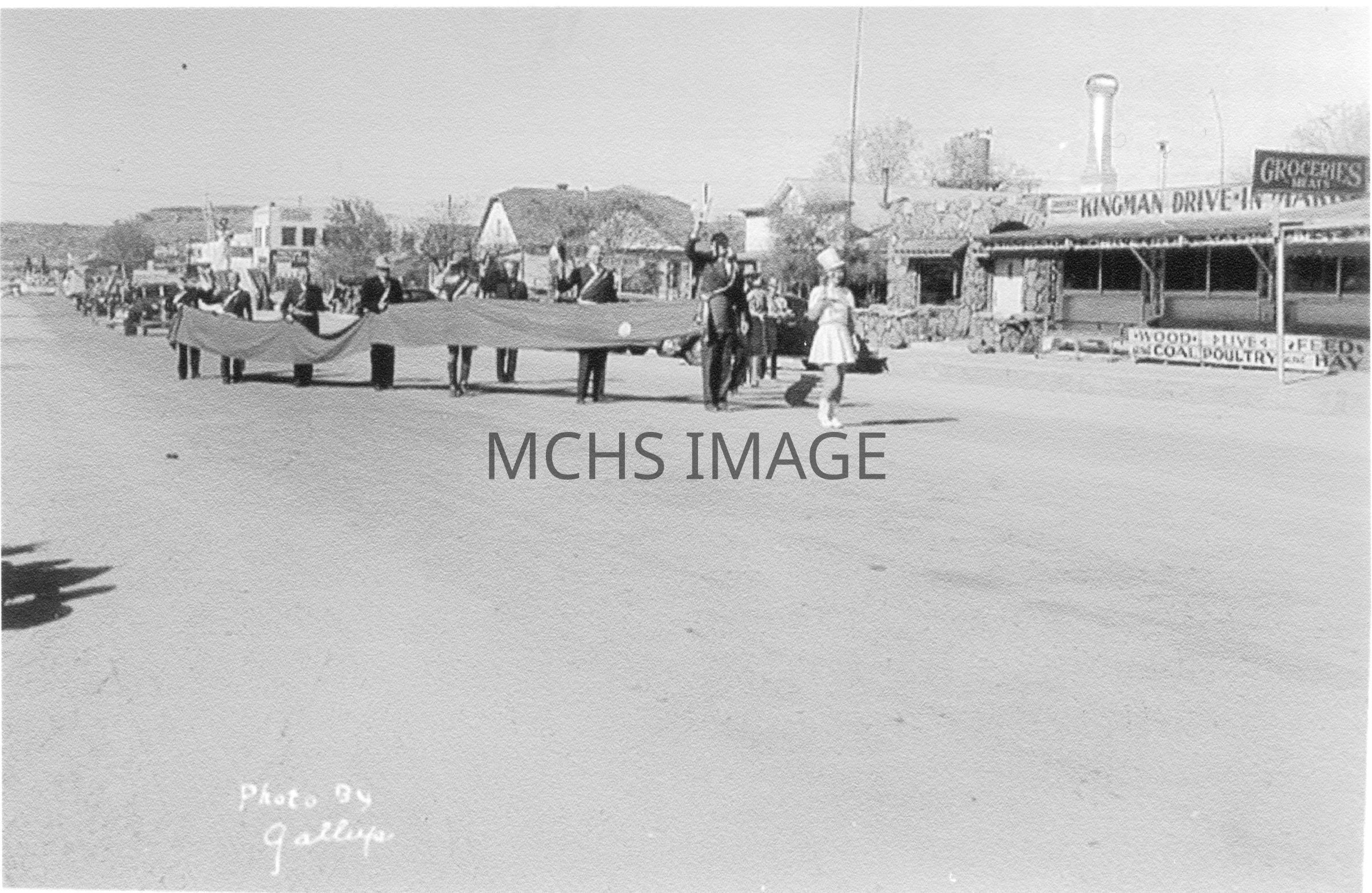 Parade on Beale Street between 3rd and 4th ca. 1948 showing Kingman Drive-In market in background
