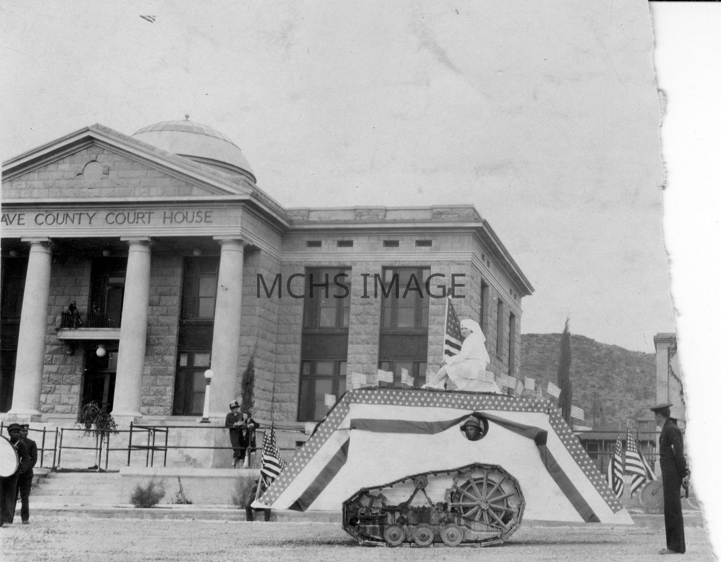 Military vehicle in parade in front of Mohave County Courthouse on Spring Street.Collection