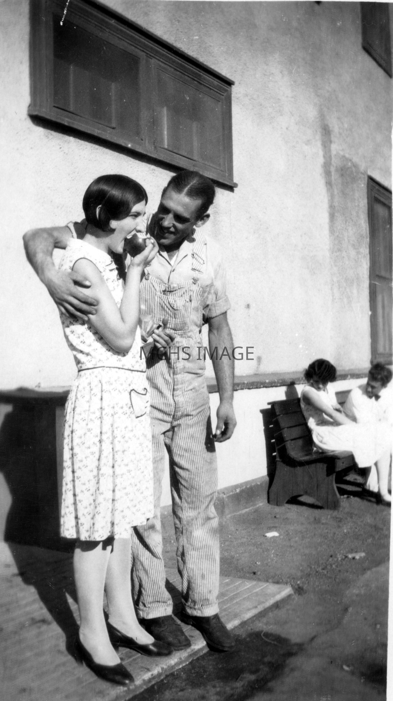 An off-duty couple, the girl is eating an apple. Another couple is in the background.Collection