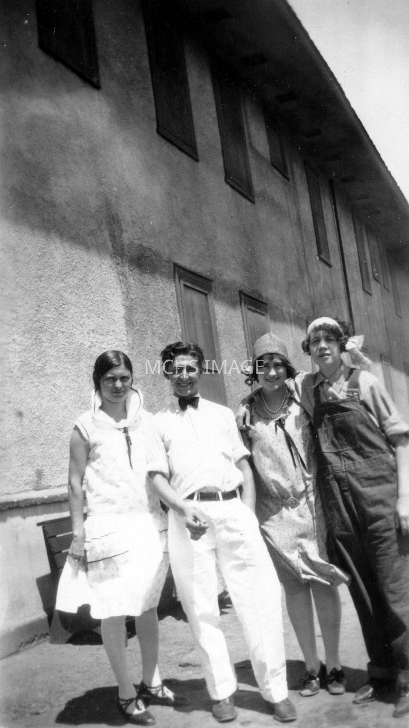 L to R: Edna, Frank Matthews, Mary, Emily Herron Matthews. Edna & Mary are wearing dresses, Emily is in bib overalls.Collection