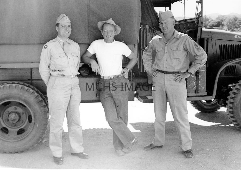 Two soldiers and Civilian in front of a Army Truck. All unknown.Collection
