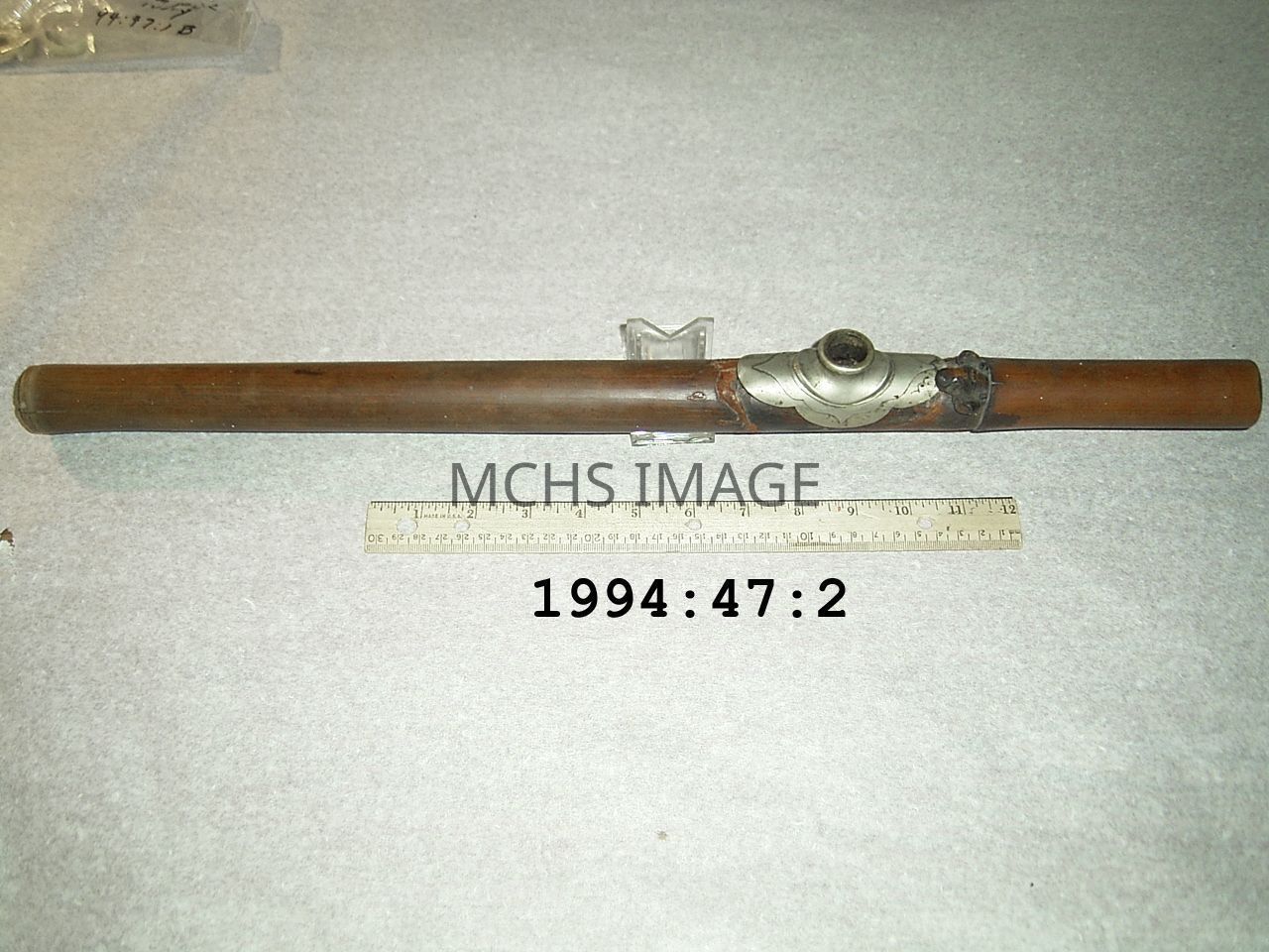 Used in 1930's, in Kingman. Found in the tunnels under the Beale Hotel after a raid on the Chinese by the Sheriff and Posse. Opium pipe is 23" x 1 -1/4", bamboo section with metal bowl, the metal surrounding the bowl has a decorative design.