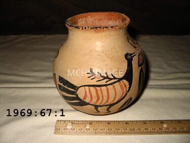 Native American pot 5-1/4" tall, 17" circumference, 3-1/4" across mouth, design on side consists of 3 turkey-like birds, motifs separated by flowers in black & red paint.