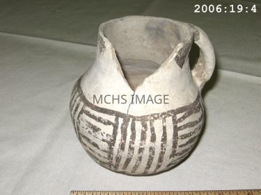 White background with black designs. 2" triangular portion broken away from lip. Badly cracked vertically from missing piece to base and partially around body of vase.