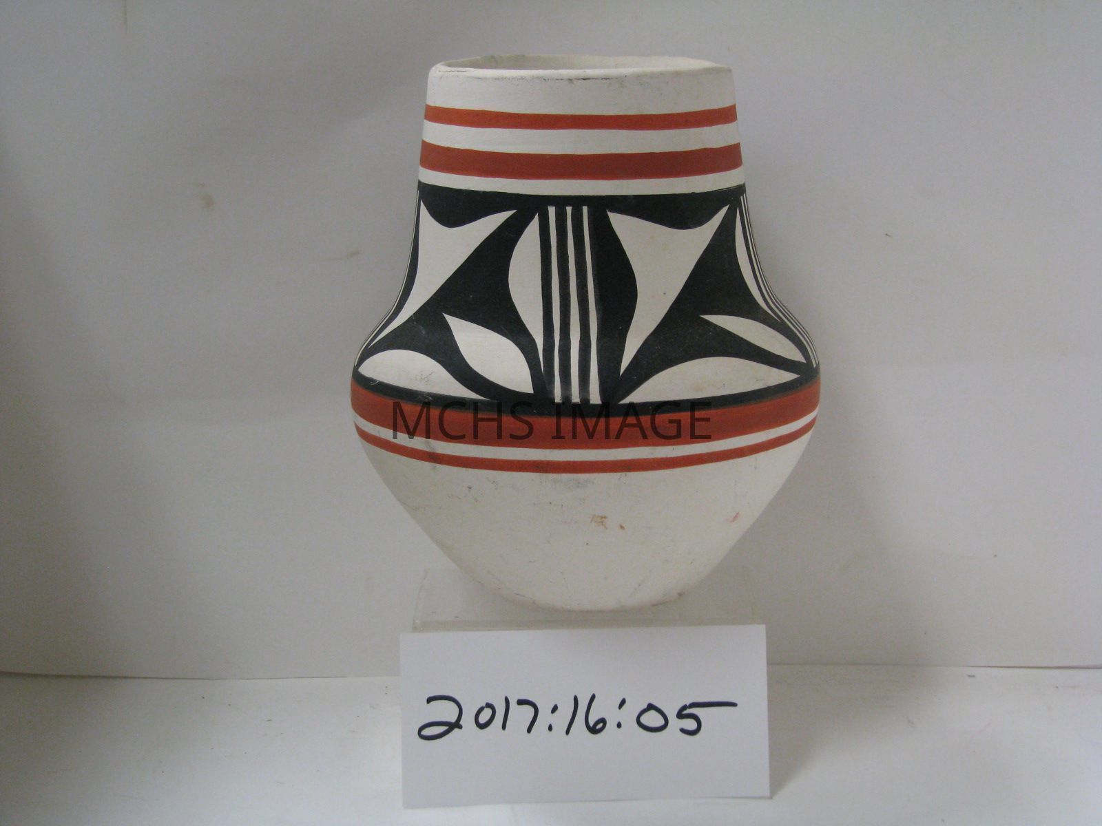 Native American pottery. 6 - 1/2" x 3 - 1/4". On bottom, written, "Koyote Acoma N. M." Egg shell white with black design and red rings around from middle to top.