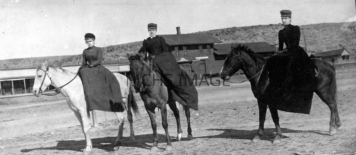 Kingman. Lady on horse on the right is Mrs. Maude McGuire (later M. Ed Carrow)
