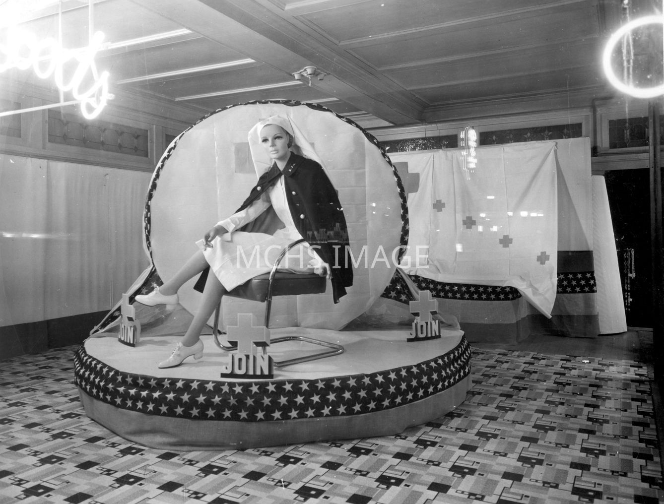 Red Cross display - World War II. A mannequin in a Red Cross uniforms positioned on a platform with 3 "JOIN" signs at the base. Beale StreetCollection