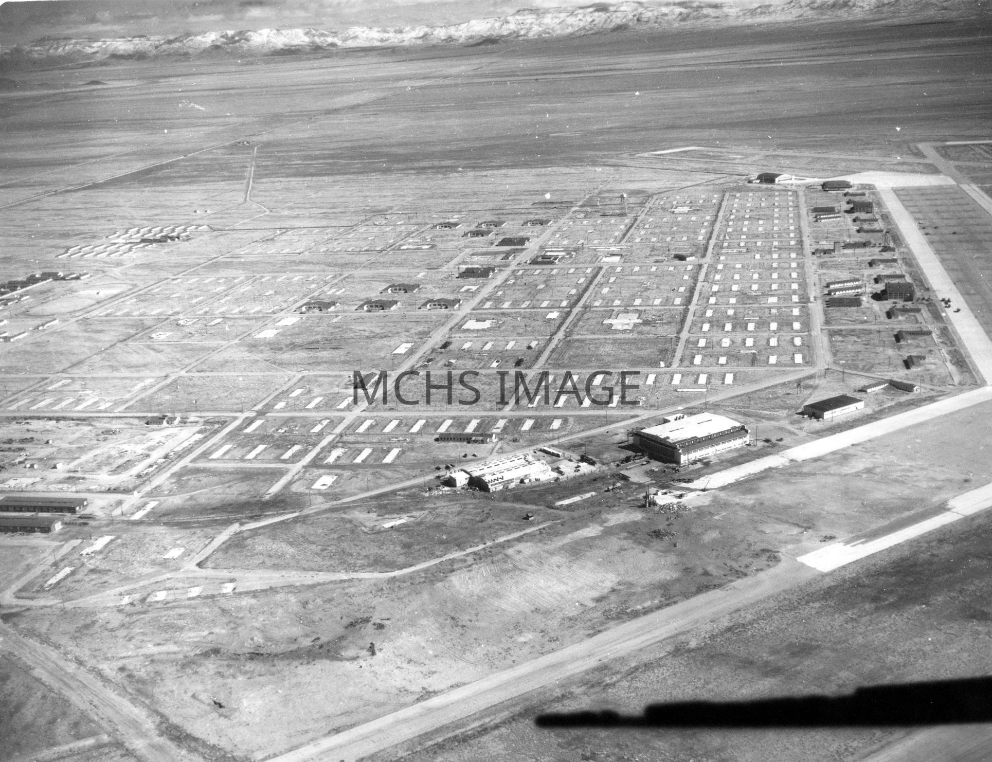 Aerial view of remains of Barracks slabs, flight line at bottom of print.Collection