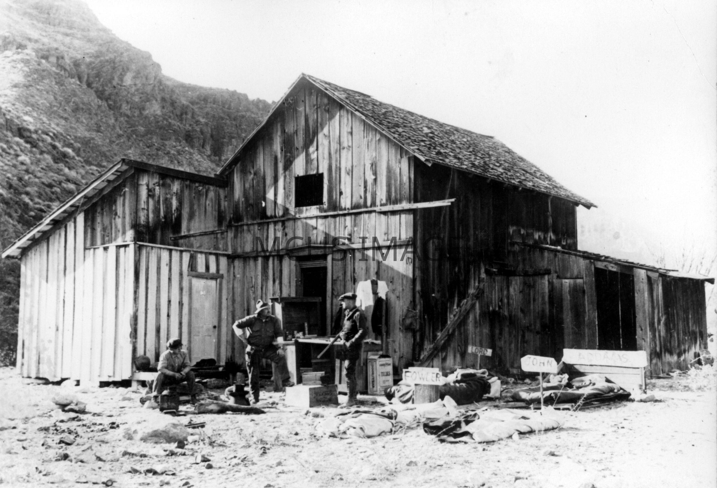 Remains of Santa Fe Hotel about 3-3 1/2 miles from mouth of Diamond Creek. This was the first site from which the public could view the Grand Canyon. Santa Fe passengers desiring to see the Grand Canyon detrained at Peach Springs, traveled by horse or wagon down Peach Springs Canyon, stayed at this hotel, and then back up Peach Springs Canyon. There was a fair auto road into this site for a number of years. Signs read "Addams, John, Fowler & Lord". (John Osterman pictured at right.) Also known as Farlee Hotel.Collection