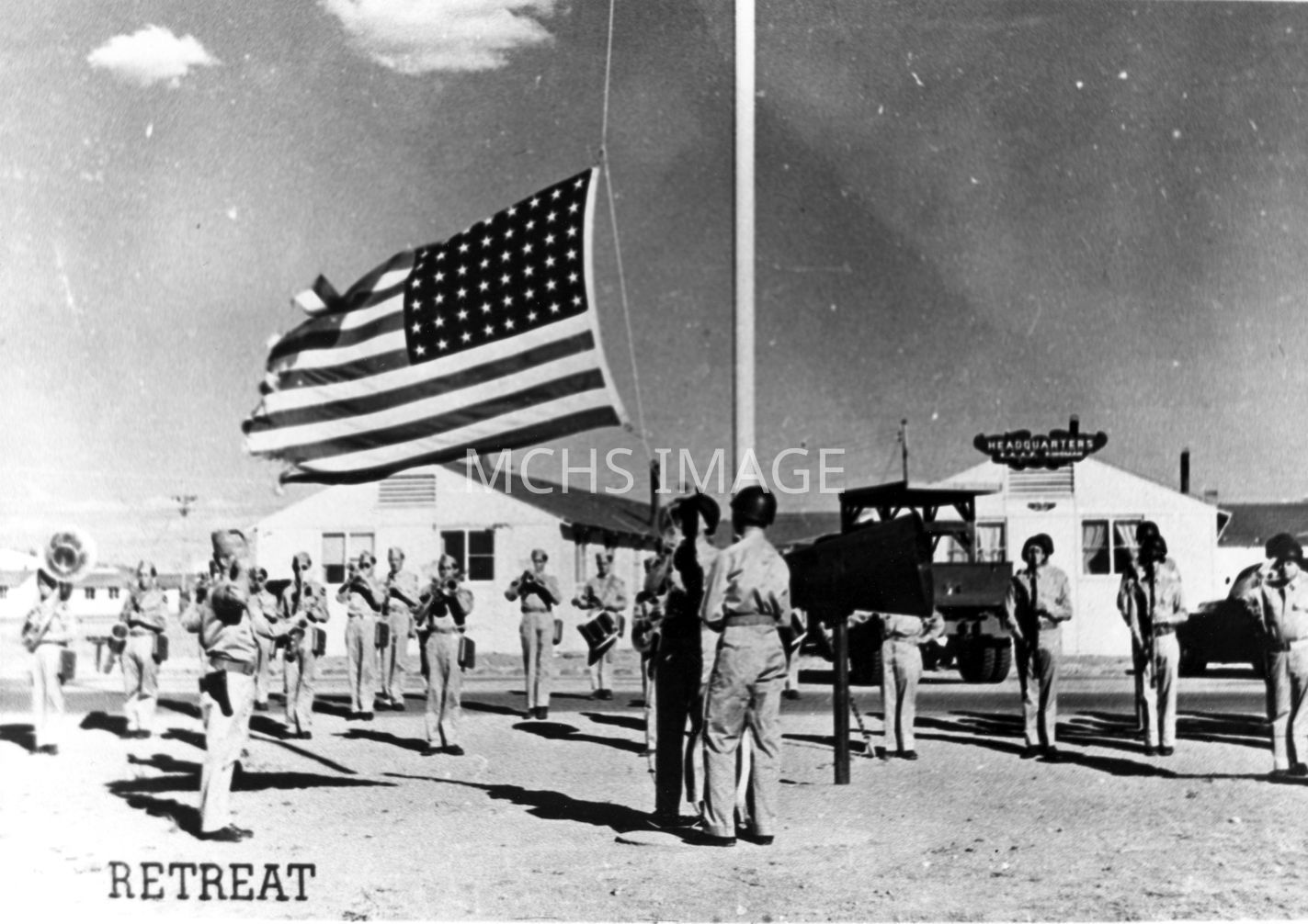 Retreat at Kingman Army Air Field, must have been a special event as the Band is shown at left in photo.Collection