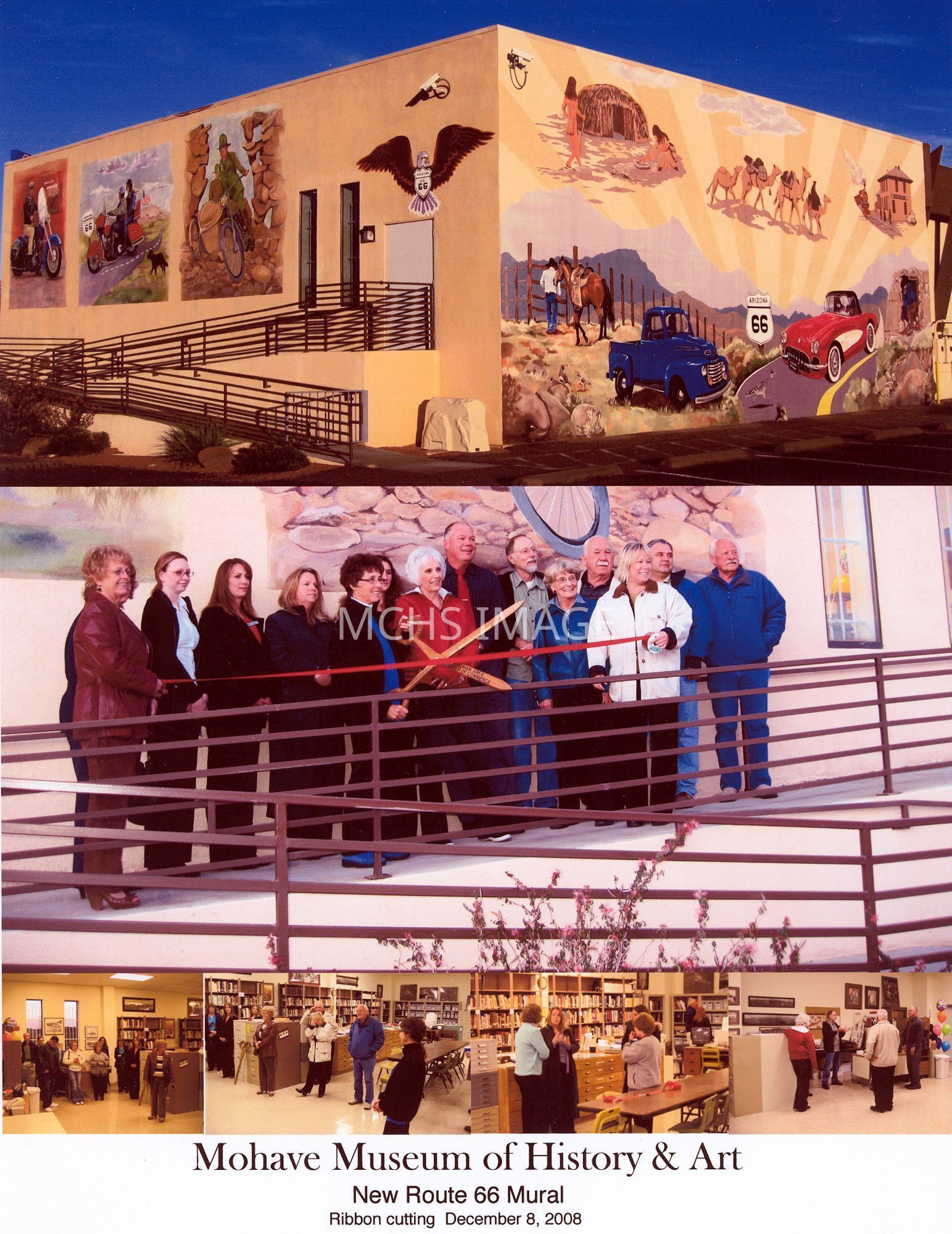 Ribbon cutting ceremony for Route 66 mural at back end of Mohave Museum. Individuals in photo include Beverly Liles at far left, Sandy Rusinko who designed and painted the mural, fifth from left, Lyn Moss, sixth from left, John Salem,seventh from left, Shannon Rossiter, eighth from left, Lorraine Hunt, ninth from left Ray Lyons, tenth from left and Mike Rusinko at far right.Collection
