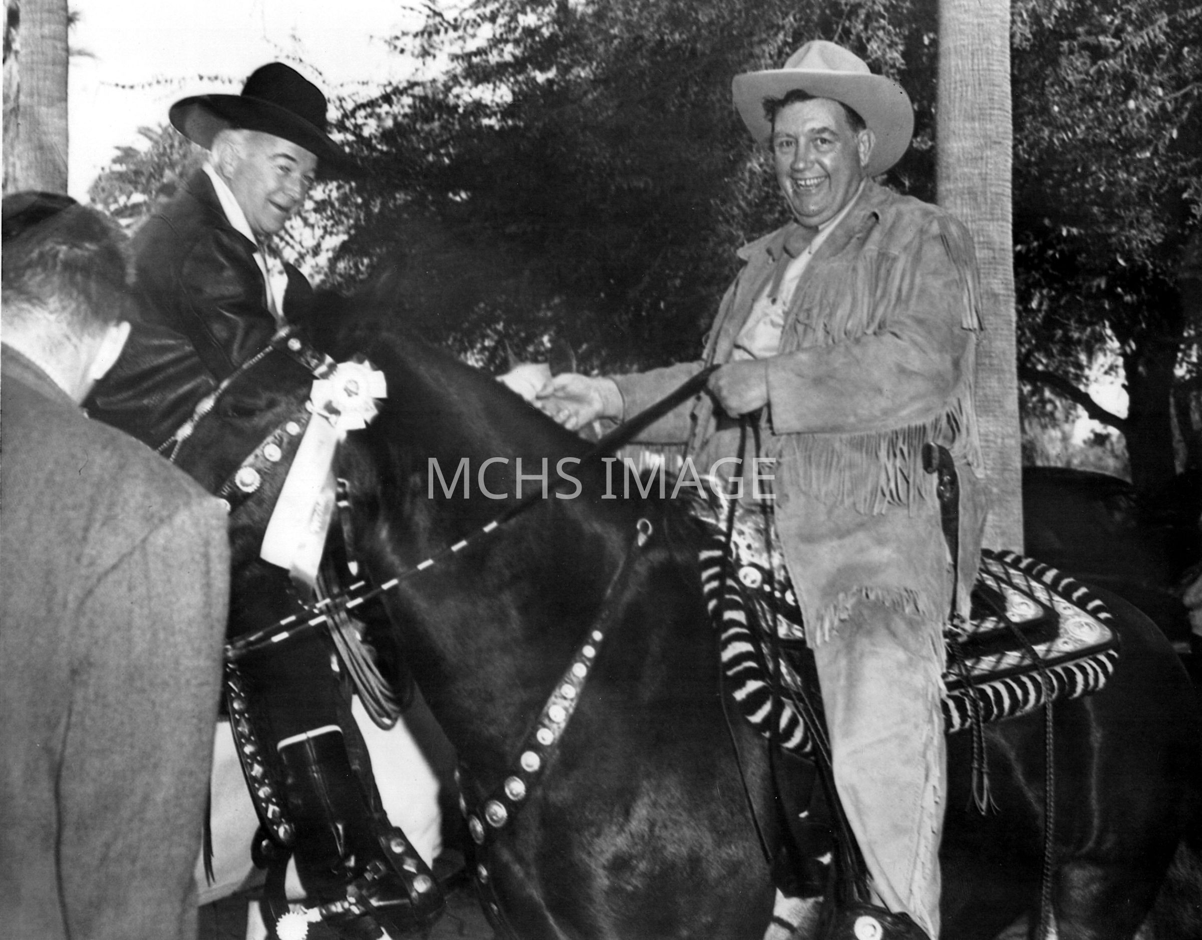 Andy Devine and Hopalong Cassidy on horseback ready to ride in Rose Parade on Colorado Blvd., Pasadena, California.Collection