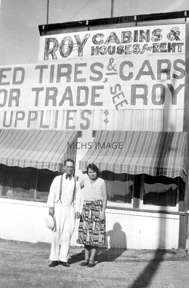 Photograph of Roy and Tommye Walker outside Roy's Service Station and Cabins date unknown.Collection