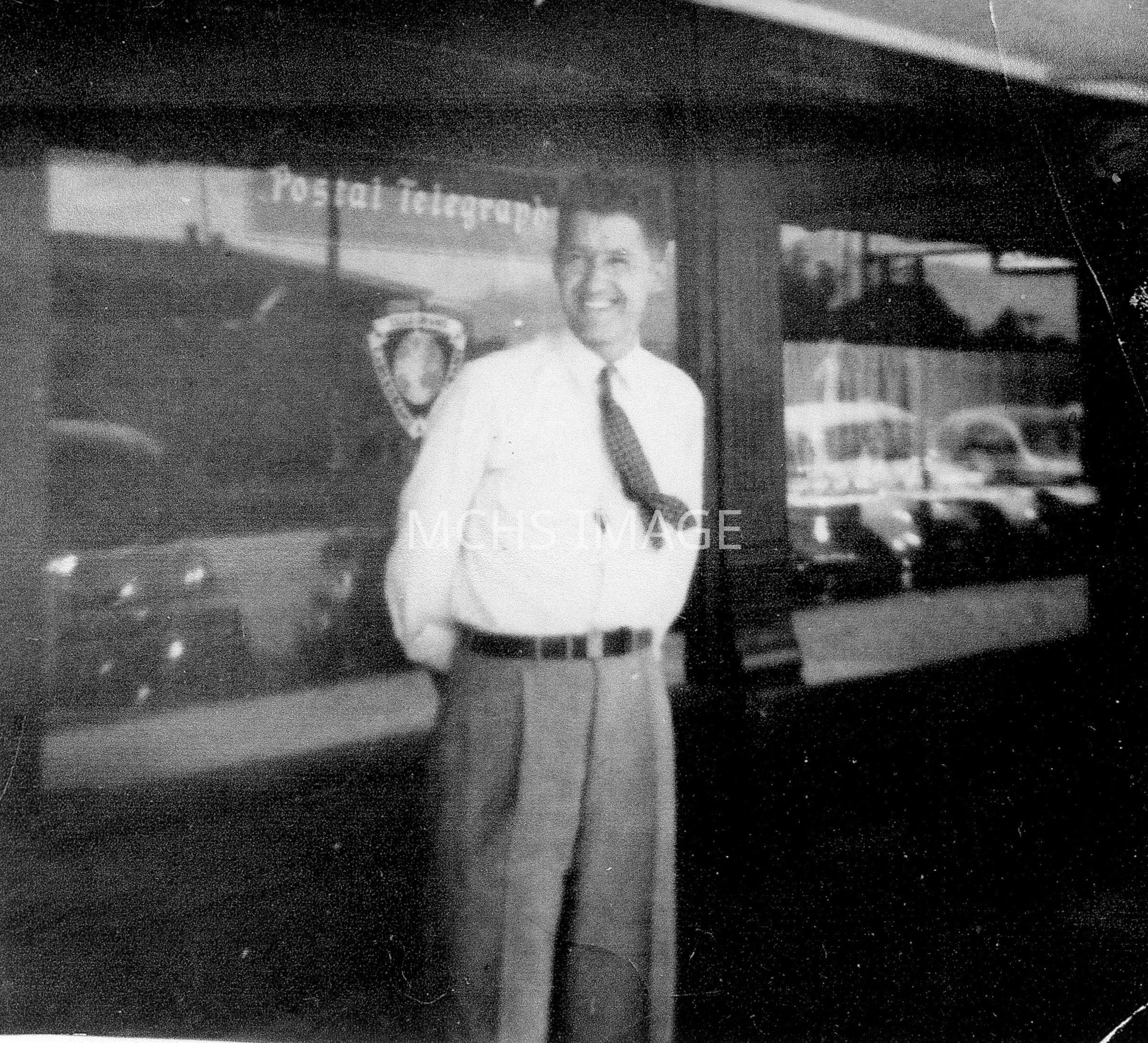 Roy Wicke in front of Postal Telegraph Office (near Beale Hotel)